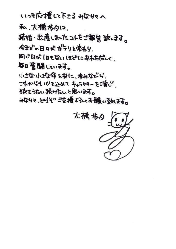 Melalui situs pribadinya, seiyuu asal Jepang Ayuru Ohashi mengumumkan bahwa dirinya sudah menikah dan telah melahirkan anak pertamanya. Meskipun begitu, dirinya akan tetap melanjutkan karirnya sebagai seiyuu dan musisi, sembari mengucapkan terima kasih kepada para staff dan fans yang telah mendukungnya selama ini.
