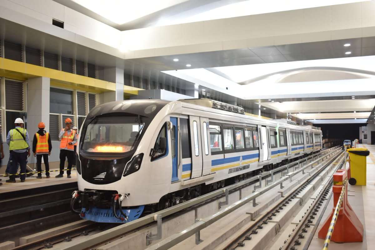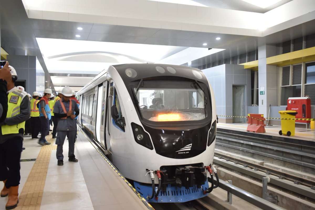 Sarana kereta LRT Sumsel saat diuji coba dan tiba di Stasiun Bandara. | Sumber: Sosial media Dirjen KA.