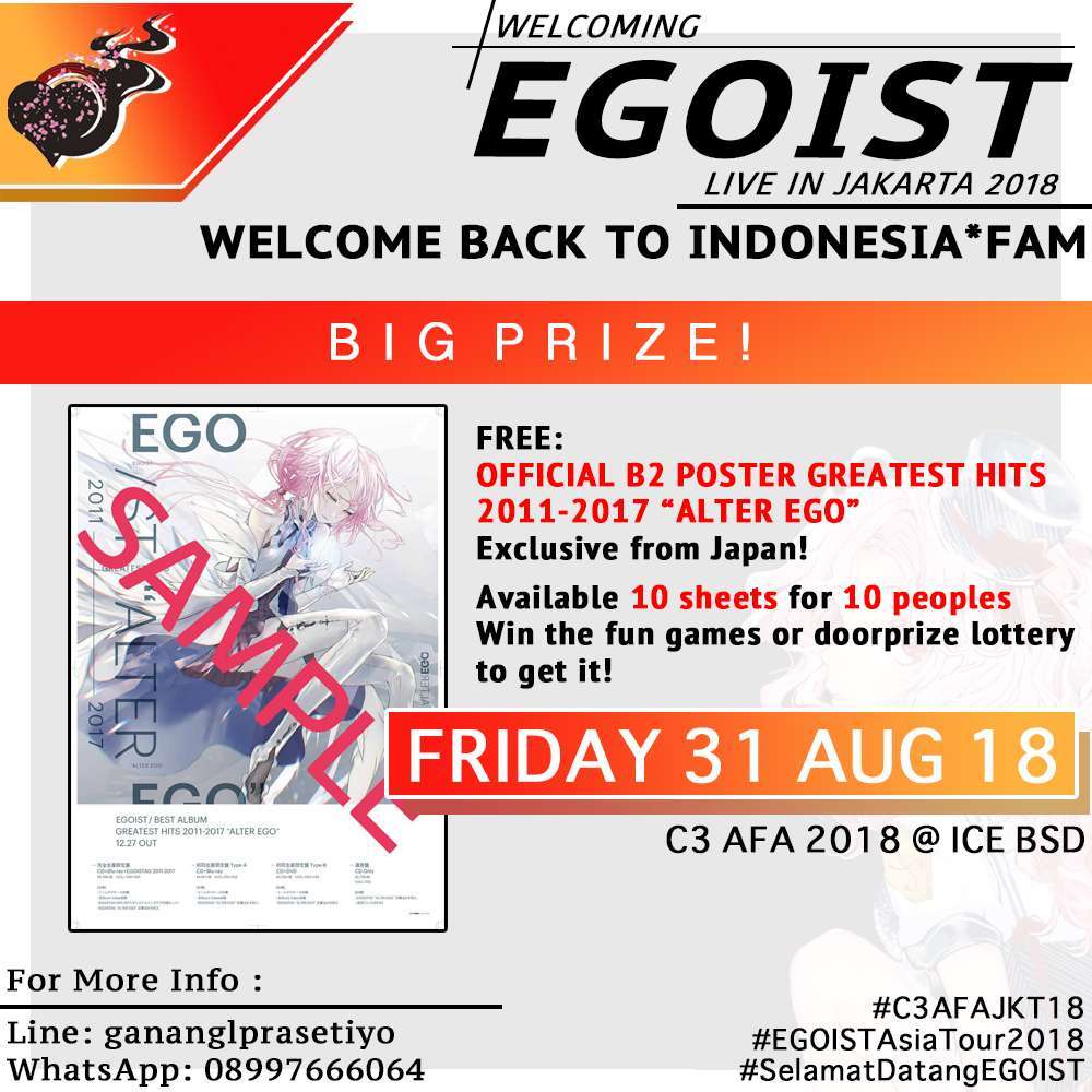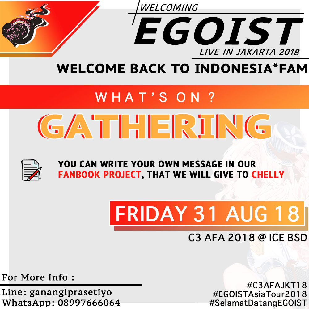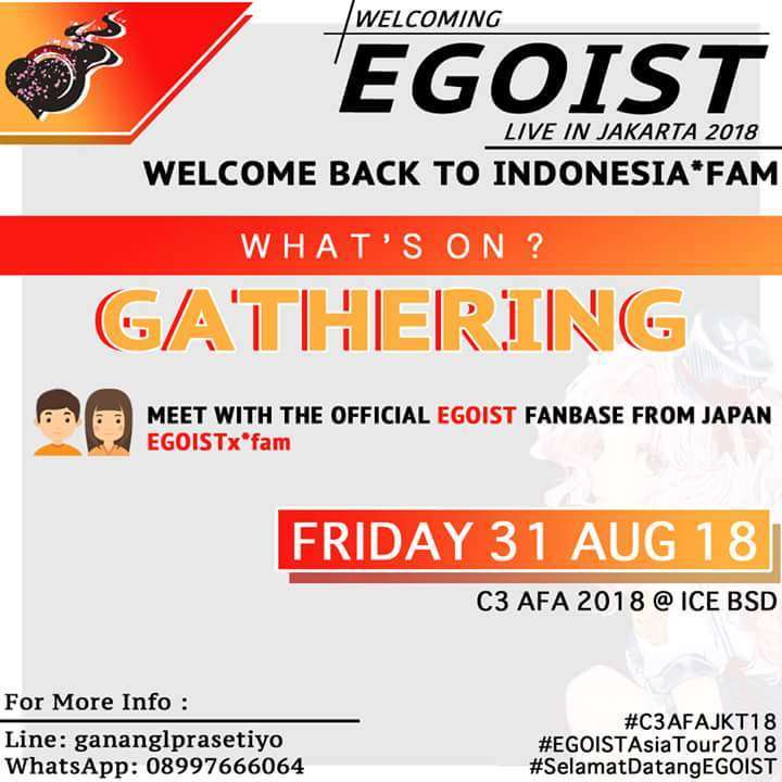 Tidak tanggung-tanggung, gathering akbar fans EGOIST di Indonesia ini juga akan dihadiri oleh para EGOISTix*fam (fans resmi EGOIST dari Jepang) yang juga datang menonton konser di C3 AFA Jakarta 2018. Kalian yang akan datang tentunya bisa berkenalan dan foto bersama fans dari Jepang tersebut.