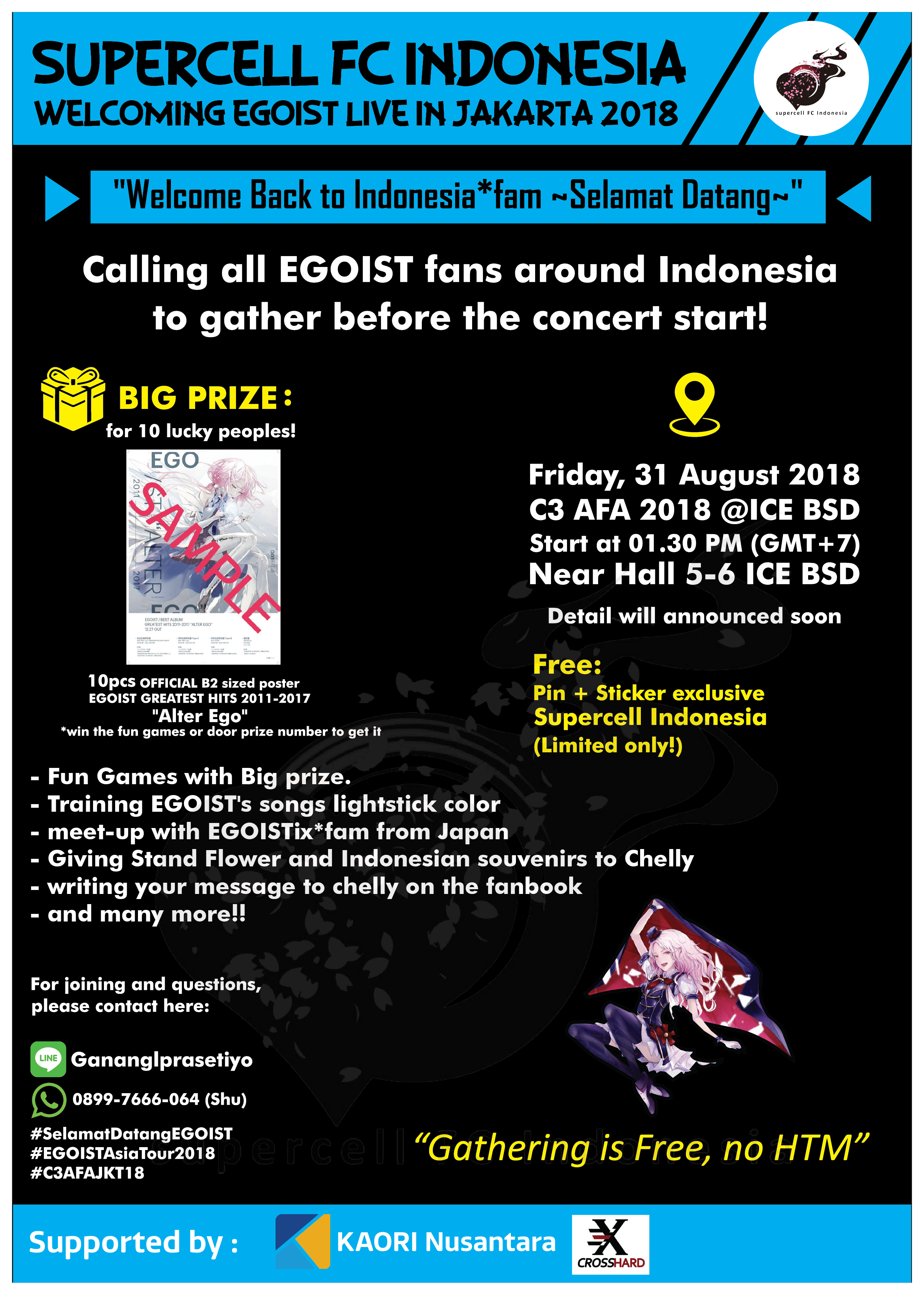 Gathering akbar ini akan diadakan di hari yang sama saat konser EGOIST digelar, 31 Agustus 2018, pada beberapa jam sebelum konser dimulai, tepatnya pukul 13.30 WIB di area ICE BSD. Titik kumpulnya akan diumumkan menyusul menyesuaikan denah acara C3 AFA Jakarta 2018 nanti. Kalian bisa memantau update-nya dari facebook Supercell-EGOIST FC Indonesia atau hubungi CP yang tertera di akhir artikel ini. Lalu, apa saja yang akan diadakan dalam gathering akbar ini?