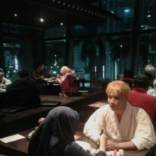 Ketika mulai masuk ke cafe ini, saya disambut dengan nuansa Jepang otentik yang dihadirkan oleh restorannya terasa “memperkuat” tema ninja yang dihadirkan oleh event cosplay cafe ini. Setelah disambut oleh para cast… atau lebih tepatnya para “ninja” dari Desa Konoha dan sekitarnya ketika masuk ke cafe ini, saya kemudian bertemu dengan salah satu cast yang sebelumnya telah saya pilih, Sakura. Dan di sesi yang saya ikuti, ternyata saya tidak sendiri karena saya semeja dengan pengunjung lain yang berasal dari Bekasi. Suasana ketika di sesi yang saya ikuti pun cukup ramai, dengan beberapa pengunjung yang datang juga turut bercosplay menjadi salah satu karakter dari serial Naruto.