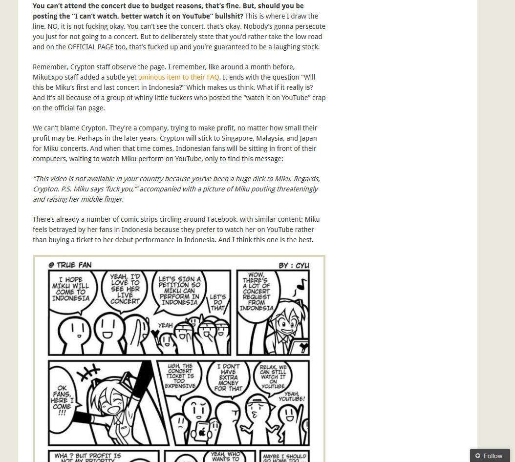 “Miku menggunakan rok pendek, saya khawatir pemuka agama Islam di Indonesia akan bereaksi keras saat melihat Miku di Indonesia,” tuturnya dalam diskusi dengan KAORI.