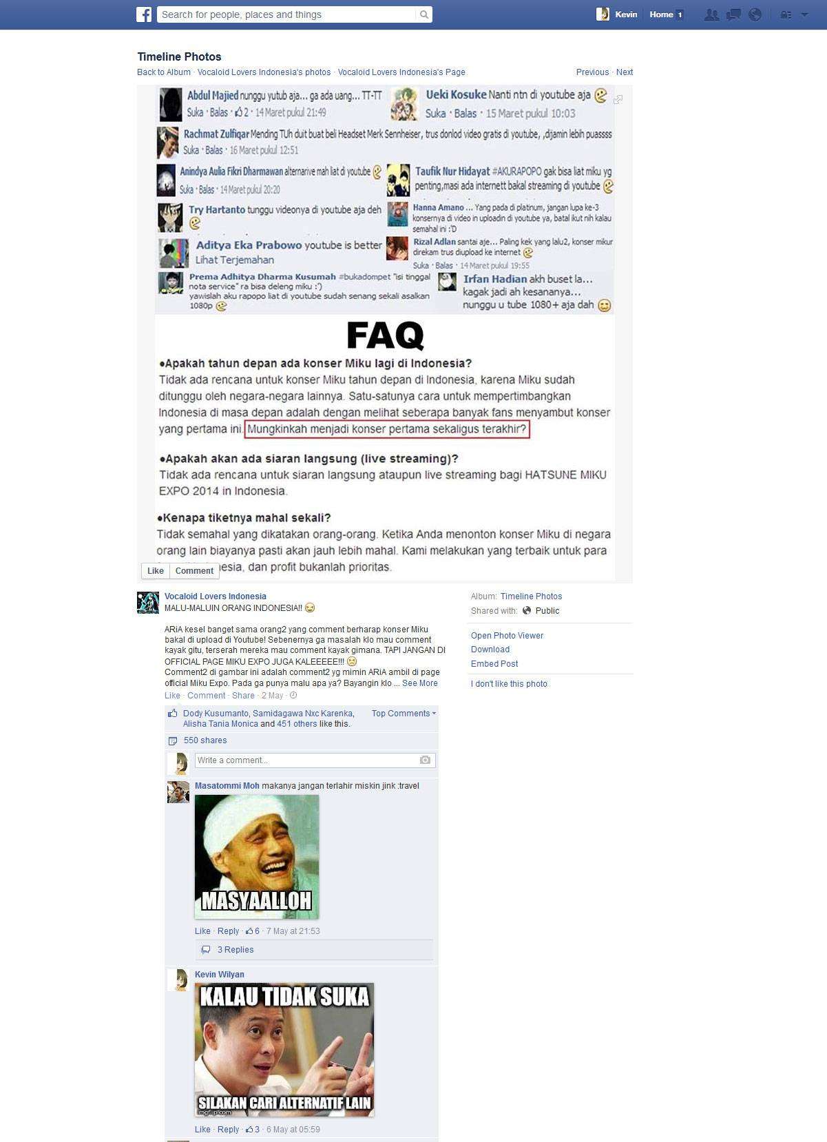 Pada status laman Vocaloid Lovers Indonesia yang dimuat tanggal 2 Mei 2014, ia mengabadikan beberapa komentar yang menurutnya “tidak pantas”, dan kemudian diangkat oleh situs J-Cul pada tanggal 7 Mei 2014.