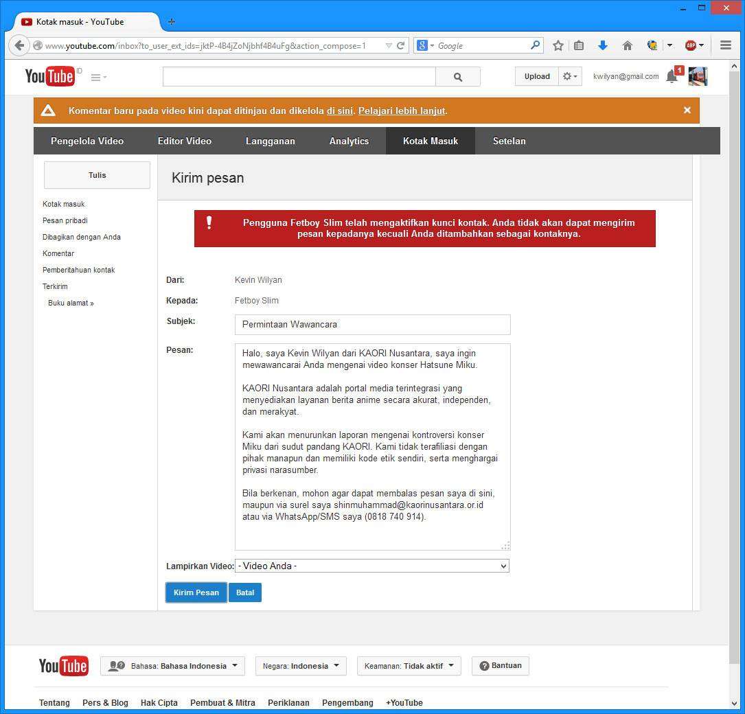 wacana upload ke utube itu mustinya cukup diperingatkan di comment di bawahnya, gak perlu di blow up, apalagi sampe keluar Indo. mana pake screenshot pula, jadi kasian sama yang kena screenshot :v