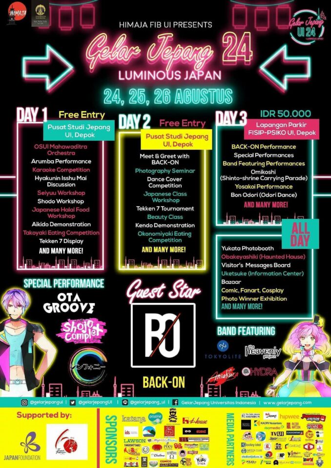 Gelar Jepang Universitas Indonesia, festival budaya Jepang yang diselenggarakan oleh Himpunan Mahasiswa Japanologi FIB UI kembali lagi tahun ini! Dalam penyelenggaraannya yang ke-24, Gelar Jepang Universitas Indonesia 24 (GJUI 24) mengusung tema “Luminous Japan” dan berupaya untuk menampilkan budaya pop Jepang yang meriah dan gemerlap namun tidak kehilangan ciri khas budayanya.