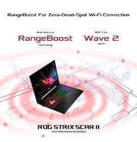 ROG Strix GL504 adalah laptop gaming pertama di dunia yang hadir dengan Wi-Fi multi-antena untuk jangkauan 30% lebih baik, throughput Wi-Fi yang lebih tinggi, dan koneksi lebih stabil. Teknologi ROG RangeBoost yang dipatenkan menggabungkan empat antena yang terletak di bagian belakang dan depan laptop dengan algoritme unik.