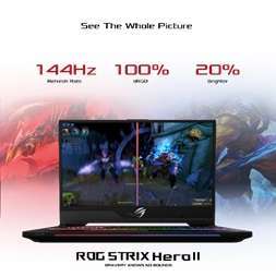 Untuk pengalaman bermain yang maksimal dalam game MOBA yang serba cepat, ROG Strix GL504 Hero II yang didaulat sebagai laptop gaming berlayar 144Hz 3ms dengan bezel super tipis pertama di dunia ini hadir dengan 100% warna sRGB. Desain baru tersebut menghasilkan frame layar tipis yang tak lagi menggangu, sehingga dimensi chassis dapat dikurangi seminimal mungkin. Strix Hero II 2.33cm lebih ringkas dari pendahulunya, tetapi tidak mengorbankan ruang layar yang berharga.