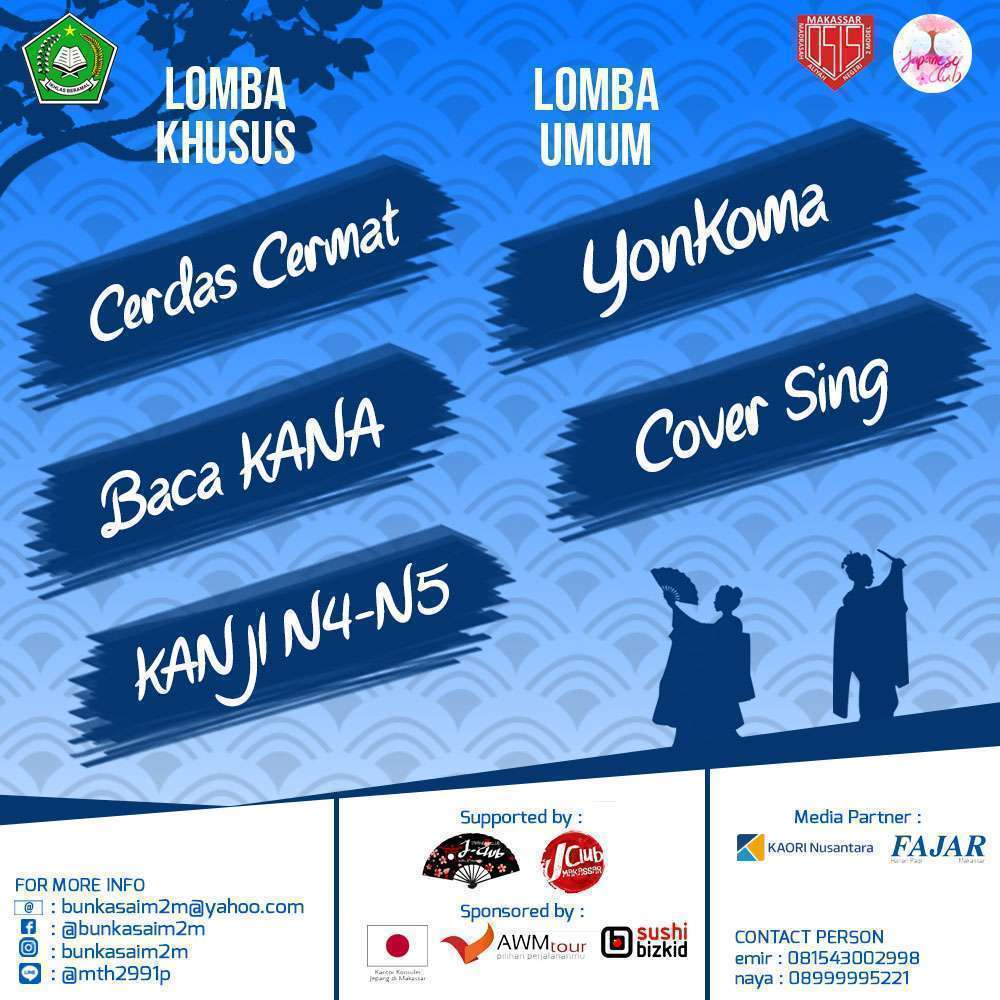 Di antara lomba kami yaitu baca kana, kanji, cerdas cermat, yonkoma, dan cover sing. Wah keliatan seru ya! Segera mendaftar di contact person kami dan datang ke eventnya.