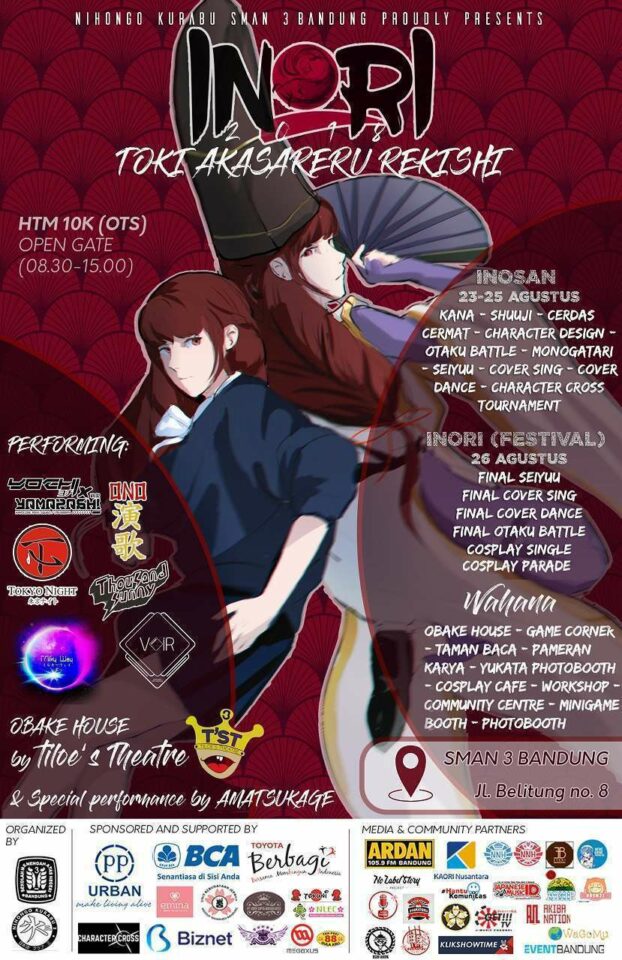 Pada tanggal 26 Agustus 2018, INORI yang merupakan acara festival akan dimeriahkan oleh performance menarik dari para bintang tamu. Pada INORI tahun ini menghadirkan Ono Enka, VOiR, Tokyo Night, Milky Way, Thousand Sunny, dan Yochi x Yamarashi. Tak lupa juga berbagai wahana menarik seperti Obake House yang bekerja sama dengan Tiloe’s Theatre SMA Negeri 3 Bandung, Yukata Photobooth yang bekerja sama dengan Unit Kebudayaan Jepang ITB, Game Corner yang bekerja sama dengan Character Cross, Cosplay Café yang bekerja sama dengan Black Crown Academy, Workshop yang akan diisi oleh NLEC dan Nihongo Kurabu 3 SMA Negeri 3 Bandung, Minigame Booth, Taman Baca, Pameran Karya, Photobooth, dan Community Center yang seru untuk dijelajahi.