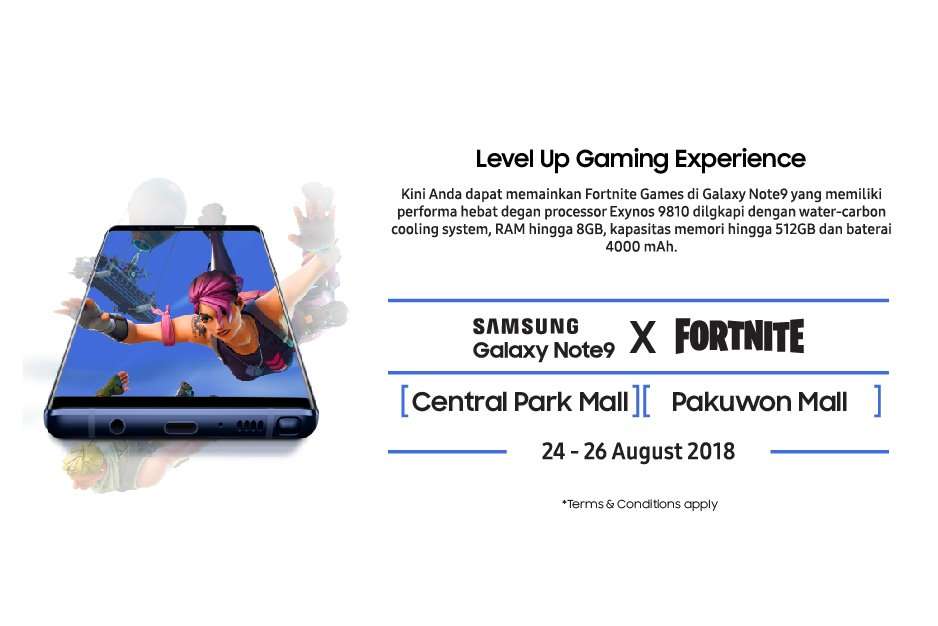 Bicara soal Gaming, dalam peluncurannya di Indonesia, akan ada satu event khusus yaitu Fortnite Battle Royale Duos & Squad Challenge yang berlangsung di dua lokasi yang sudah ditentukan yaitu Central Park Mall, Jakarta, dan Pakuwon Mall, Surabaya, yang menyediakan hadiah GALAXY NOTE 9!