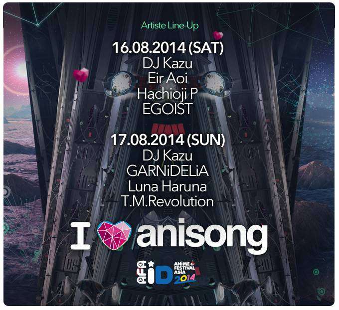 Setelah beberapa lama dibuat penasaran, akhirnya pada hari ini, pihak SOZO PTE LTD selaku penyelenggara Anime Festival Asia di Indonesia (AFAID) 2014 mengumumkan daftar artis yang akan mengisi pagelaran konser bertajuk “I Love ANISONG” dalam AFAID 2014 tahun ini. Berikut adalah daftar artis tersebut: