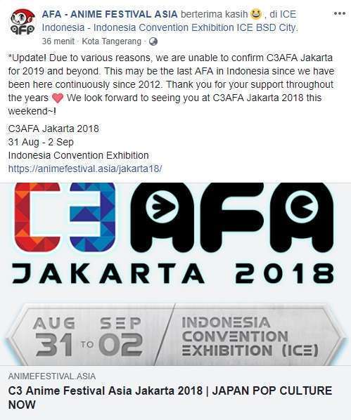 Di hari-hari menjelang diadakannya C3AFA Jakarta 2018, tiba-tiba saja sebuah berita yang cukup mengejutkan diumumkan melalui akun Facebook resmi AFA – ANIME FESTIVAL ASIA. Dalam pengumuman tersebut, C3 AFA Jakarta 2018 disebut-sebut bisa saja menjadi terakhir kalinya perhelatan Anime Festival Asia diselenggarakan di Indonesia, dan tidak akan ada C3AFA Jakarta 2019, maupun C3 AFA Jakarta di tahun-tahun berikutnya. Pihak menyelenggara tidak memberitahukan alasannya secara jelas, dan hanya mengucapkan terima kasih atas dukungan masyarakat atas Anime Festival Asia yang telah digelar di Indonesia sejak tahun 2012.