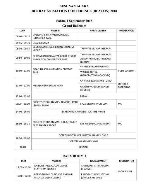 Perhelatan BEACON 2018 Jakarta diawali dengan peresmian dibukanya acara oleh Deputo Riset Edukasi dan Pengembangan Abdur Rohim Boy Berawi dan press conference serta diramaikan dengan beragam event seperti Talkshow, Business Link & Match, Panel Discussion, Booth Exhibition, Masterclass, dan Animation Screening Si Juki the Movie dan juga D.O.A: Doyok Otoy Ali Oncom, dan trailer film animasi Jagat. Sementara itu acara BEACON juga akan diramaikan dengan diskusi panel dan seminar seperti Road to Asia Animation Summit 2018 oleh Daniel Harjanto (Base Studio) dan Wahyu Aditya (Hellomotion), Membangun Local Hero oleh Chris Lie (Caravan Studio) dan Goklas Sujiwo (BumiLangit), Success Story Animasi Tembus Layar Lebar – Si Juki oleh Faza Meonk, (Pionicon), Project Story Animasi D.O.A: Doyok Otoy Ali Oncom dan animasi Jagat oleh Eki N.F (MPIC Animation), Animasi yang Cocok untuk Platform Media Sosial oleh Andi Martin (Kratoon Channel), Berbagi Ilmu di Bidang Animasi Melalui Media Online oleh Rangga Yudo Yuwono (Dapoer Animasi), Potensi Bisnis Industri Animasi di Indonesia dan Revenue Animasi dari TV oleh Sei Young Cheong “Andy” dari MNC Animation, Karir dan Profesi Animasi oleh Ronny Gani (Bengkel Animasi), Success Story Animasi Tembus Layar Lebar – Knight Kris oleh Ridwan Santoso (Viva Vantasia), Success Story Animasi Tembus Layar Lebar – Battle of Surabaya oleh Aryanto Yuniawan (MSV Studio), Story Telling Dalam Animasi oleh Daryl Wilson (Kumata Studio), Distribusi Animasi via Youtube oleh Fajar Nurwantoro (Kul Story Indonesia), Animasi AR/VR oleh Patrick Effenry (Visual Expert), Membuat IP Bible yang Menjual oleh Chandra Endroputro (BASE Studio) yang berlangsung dari tanggal 1 – 2 September 2018.