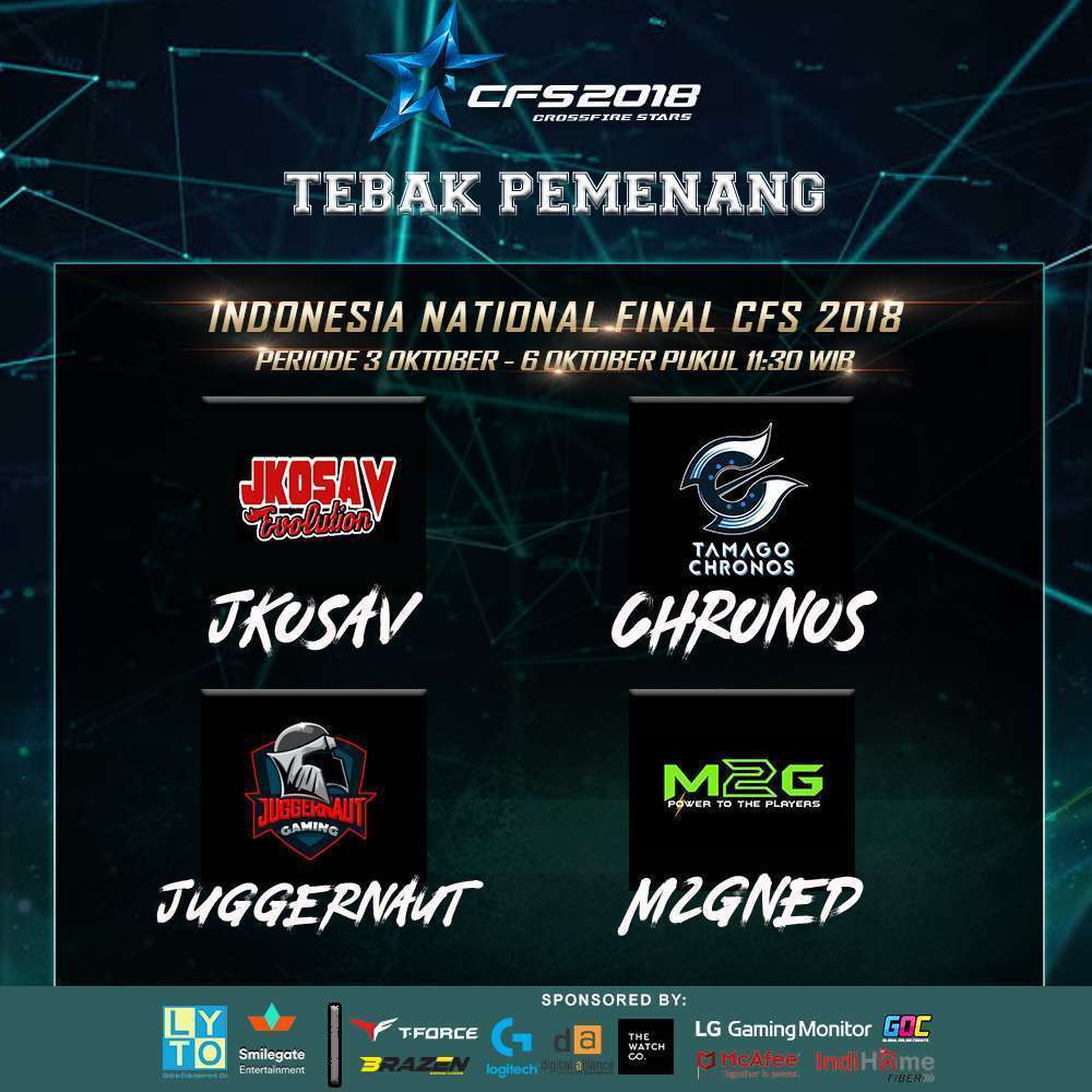 Tim Crossfire Next Generation sudah menyiapkan event tambahan, yaitu Tebak Pemenang CFS 2018. Kamu berkesempatan untuk mendapatkan item keren berdurasi hingga item permanent lho. Caranya gampang banget, kamu hanya perlu tebak pemenang CFS 2018 Indonesia National Final dan comment di Fanpage Official Crossfire Next Generation.