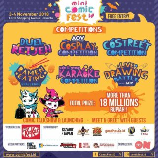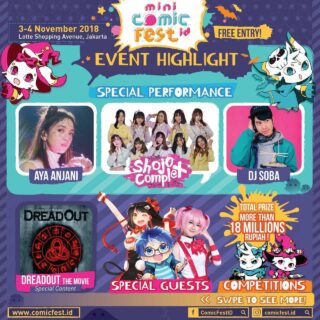 Setelah menuai sukses dengan acara Comicfest ID 2018 yang diadakan di Epicentrum Walk pada bulan Juli lalu, kali ini re:ON Event Organizer kembali menghadirkan acara Mini Comicfest ID 2018 yang akan diadakan pada hari Sabtu dan Minggu, 3 & 4 November 2018 di Lotte Shopping Avenue dan pastinya tidak akan kalah seru dari acara-acara sebelumnya!