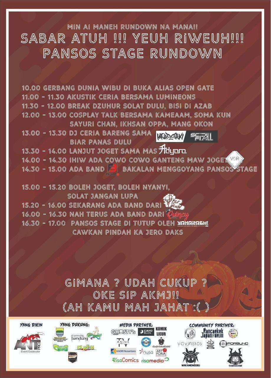 Mengusung tema “Maju Kena, Mundur Kena” seperti judul film Warkop DKI, event Bandung Wundurland hadir dengan banyak sekali acara seru, mulai dari performance dan lomba Cosplay, Band, Dance, Nyanyi, hingga EDM. Tak hanya itu, event ini juga semakin meriah dengan berbagai konten yang juga menarik, seperti talkshow bareng kreator dan cosplayer, bazaar, hingga rental PeeS! Harga tiket acaranya juga bisa dicek lewat poster di bawah ini.