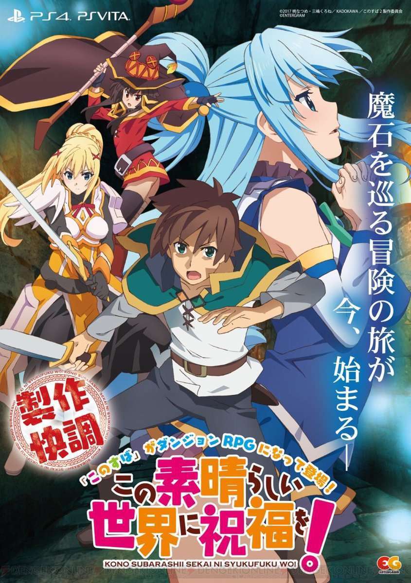 Bukan hanya itu, Konosuba juga diumumkan akan kembali diangkat menjadi game yang akan dirilis untuk Sony Playstation 4 dan Playstation Vita, dan bergenre RPG penjelajahan dungeon. Yang menarik, sebagaimana film layar lebarnya, Kazuma, Aqua, Megumin, dan Darkness juga nampak serius dalam visual dari game RPG Konosuba ini. Apalagi Aqua juga berpose tengah berdoa dengan nampak anggun. Machicho akan menyanyikan lagu tema untuk game ini, dengan lagu yang berjudul “Stand Up“. Intip visual dan trailer RPG Konosuba berikut ini: