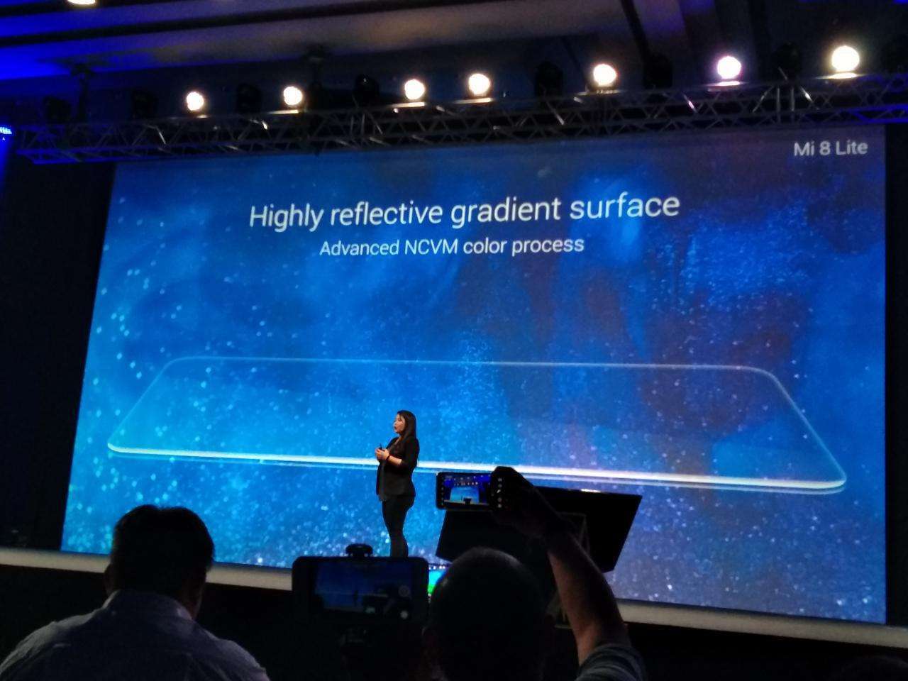 Mi 8 Lite memiliki bagian kaca belakang unik yang menggunakan proses warna NCVM, meghasilkan tampilan gradien seperti cermin yang memukai. Mi 8 Lite berukuran ramping 7,5mm serta memiliki layar penuh LCD 6,26-inci 19:9, dengan resolusi layar FHD+ (2246×1080) dan permukaan Corning Gorilla Glass 5 di bagian depan.