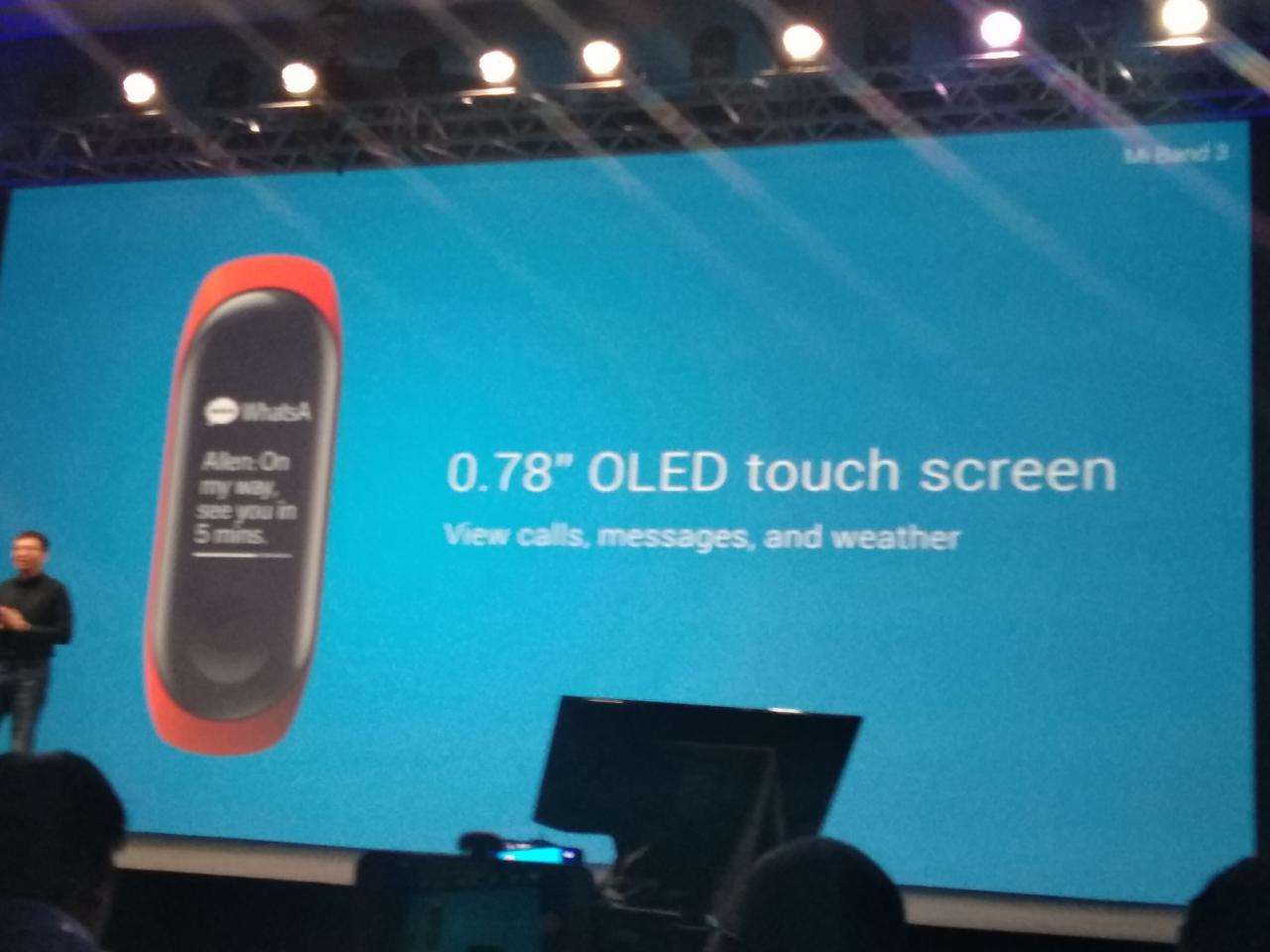 Dengan layar OLED 0,78, Mi Band 3 sekarang bisa menampilkan konten notifikasi dari ponsel anda, selain informasi waktu, tanggal dan peghitungan langkah. Perangkat ini mempunyai fitur yang ramping, desain minimalis dan navigasi mudah – pengguna bisa menarik ke atas dan bawah untuk melihat isi menu dan menggeser kiri dan kanan untuk pilihan yang lebih banyak. Fitur-fitur baru lainnya adalah ketahanan air hingga 50 m, stopwatch terintegrasi, fungsi penentu lokasi ponsel, dan fungsi alarm getar independen yang bekerja bahkan ketika smartphone dalam keadaan mati.