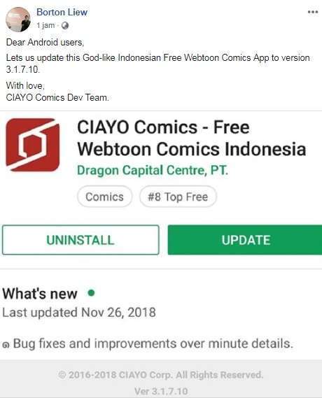 Kini demi terus memberikan pelayanan yang terbaik kepada para penggunanya menyongsong tahun 2019, platform komik digital lokal CIAYO Comics telah diumumkan akan tetap gratis. Hal ini dikonfirmasi langsung oleh Borton Liew selaku CEO dari CIAYO, yang artinya CIAYO Comics akan tetap dapat diunduh dan dibaca komiknya secara gratis dan cuma-cuma tanpa biaya sepeserpun. Cukup dengan mengunduh aplikasinya di ponsel pintar masing-masing, publik sudah bisa membaca komik-komik pilihan dari para komikus-komikus Indonesia.