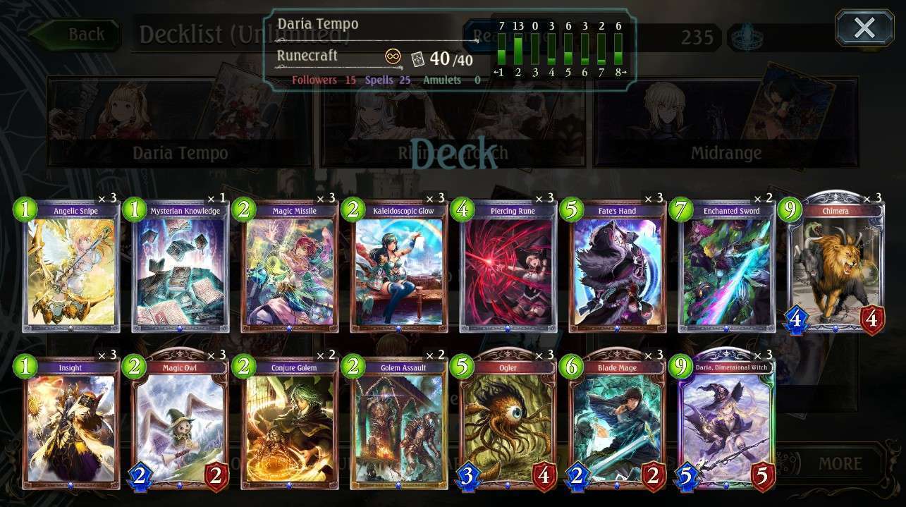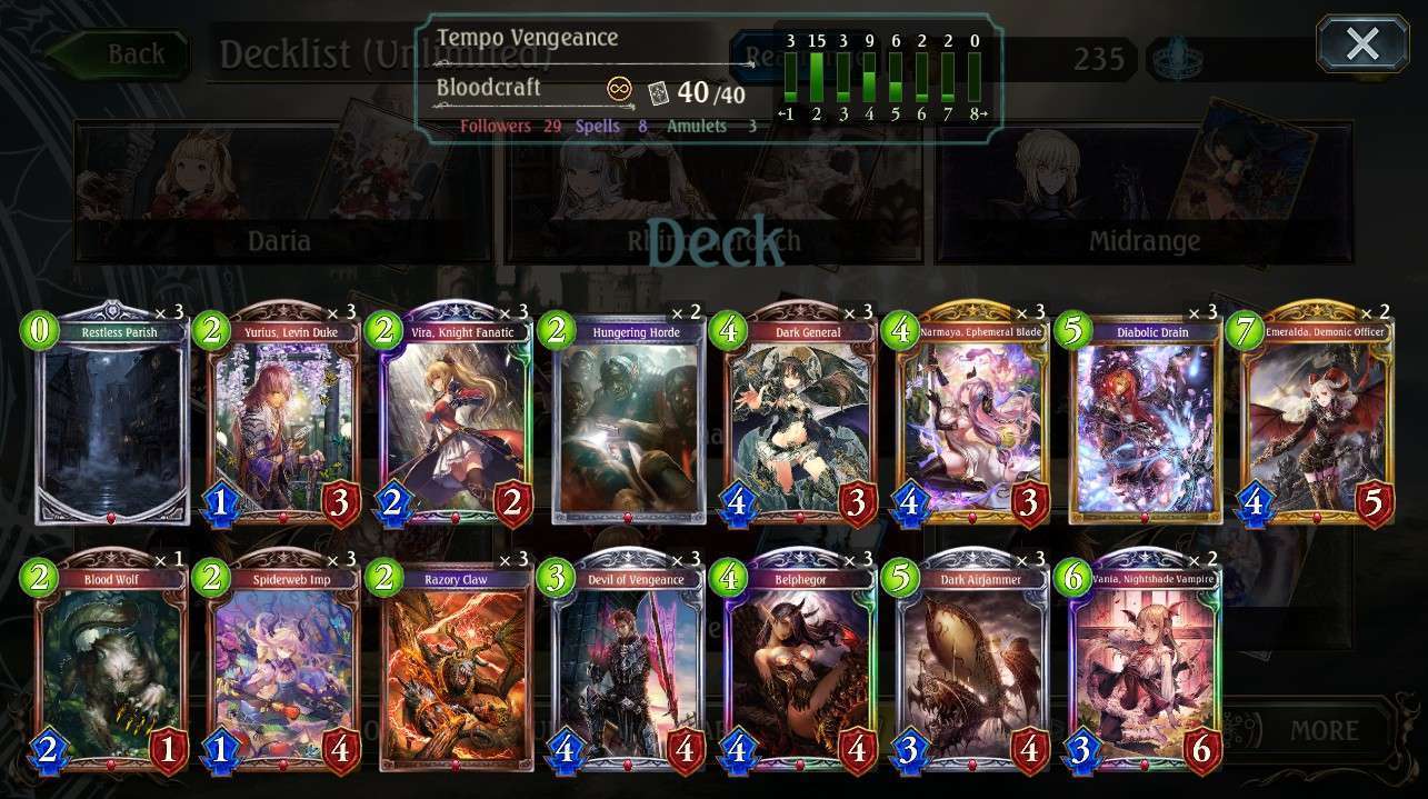 Untuk melawan deck tempo itu cukup bermain dengan santai, dan sediakan removal yang lebih banyak untuk membersihkan follower lawan, karena biasanya Deck Tempo itu memberikan pressure board dengan cara mengisi board mereka dengan Follower dengan value yang tinggi, maka dari itu kita harus siap menggunakan kartu yang bisa memutarbalikkan keadaan.