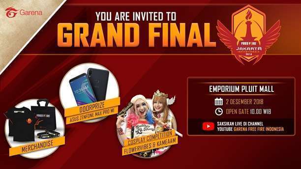 Kompetisi Battle Royale terbesar di Indonesia, Free Fire Jakarta Invitationals 2018 akan segera melaksanakan acara puncaknya. 12 Tim terbaik dari seluruh Indonesia telah terpilih dan akan bertarung di Emporium Pluit Mall, Jakarta pada tanggal 2 Desember 2018 untuk bertarung di babak grand final memperebutkan total hadiah uang tunai senilai 100 juta rupiah. Turnamen ini tidak dipungut biaya, alias gratis. Jadi, tidak ada alasan untuk tidak hadir!
