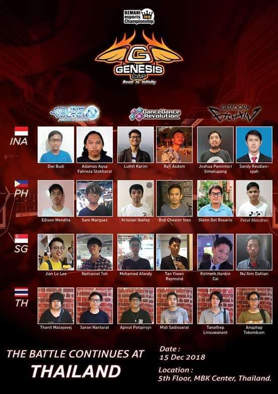 Kontingen Indonesia akan diwakili oleh 6 atlet yang terdiri dari Dwi Budi dan Adamas yang akan berlaga di game Sound Voltex 4 “Heavenly Haven”, Lutfhi Karim dan Rafi Asdom yang akan berlaga di game Dance Dance Revolution Ace, dan juga Jozzu dan Sandy X&Y yang akan berlaga di game GITADORA: EXCHAIN (Drummania). Keenam atlet ini terpilih melalui sesi pre-qualifier turnamen Genesis Cup: Road to Infinity yang diselenggarakan pada 11 Oktober 2018 hingga 11 November 2018 lalu.