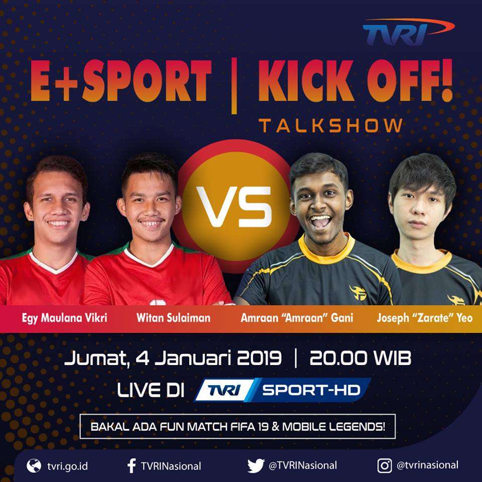 Program talk show Team Flash dan Team Egy yang diberi judul E+Sport ini akan diikuti dengan pertandingan biasa FIFA19 dan Mobile Legends, dengan berbagai peluang bagi penggemar Indonesia untuk mengenal kepribadian favorit mereka dan mengenal mereka lebih baik. Acara ini akan disiarkan langsung di saluran TVRI Sports HD dan disiarkan secara online di saluran YouTube TV Revival, pada hari Jumat 4 Januari dari 20.00 WIB hingga 22.00 WIB.