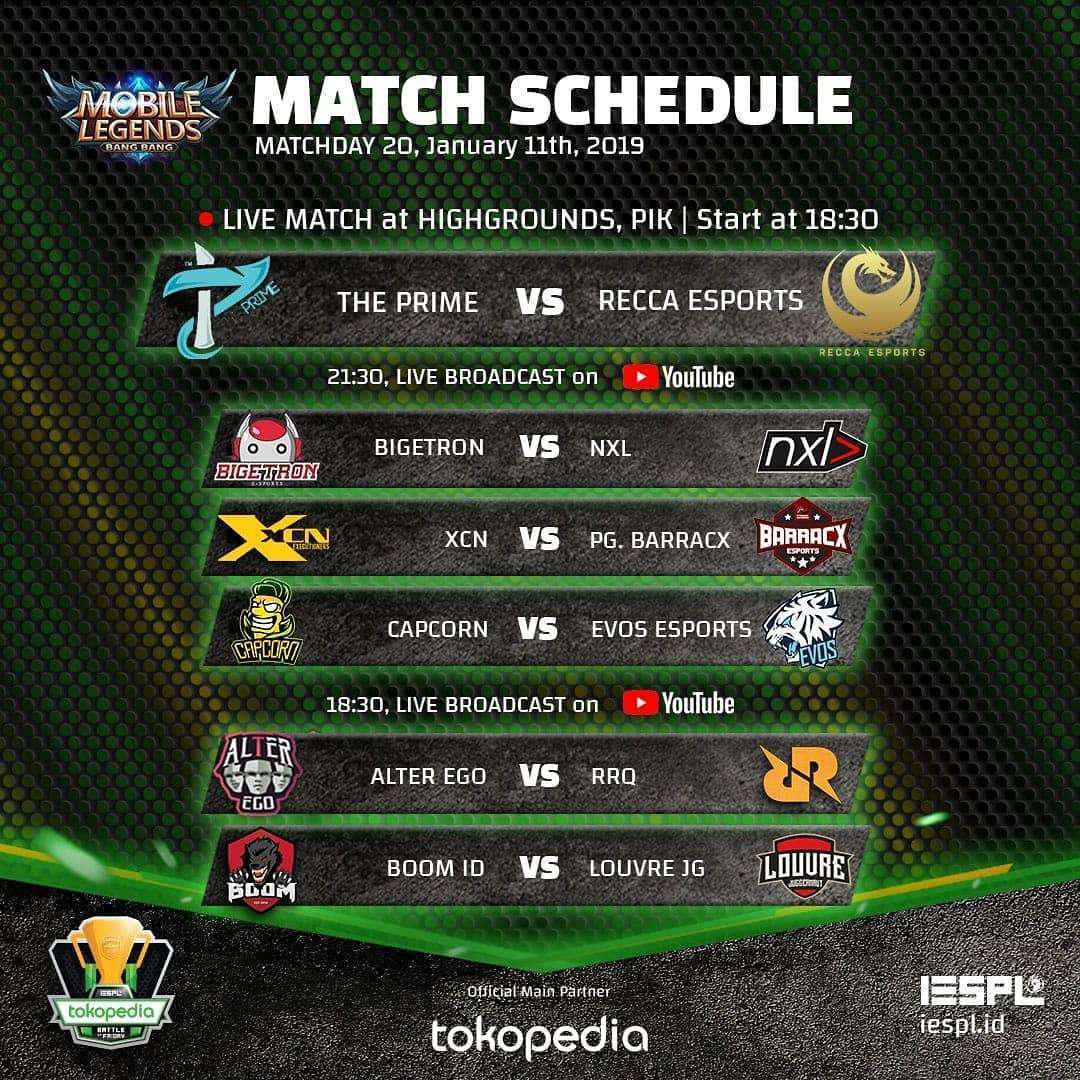 Rangkaian pertandingan Mobile Legends akan dimulai lebih dulu. Pada pertandingan langsung, The Prime akan berhadapan dengan Recca Esports. The Prime ingin memaksimalkan raihan poin mereka untuk bisa mencuri posisi empat besar sementara Recca Esports pasti ingin menambah pundi-pundi poin untuk raihan tim. Kedua tim sempat mengganti roster mereka dan ini akan jadi ajang pembuktian apakah pemain baru mereka mampu bermain sangat baik menuju akhir musim.