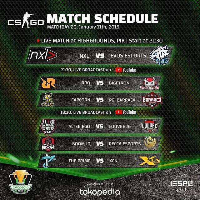 Pada Matchday ke-20 Tokopedia Battle of Friday akan tersaji laga panas menuju akhir musim pertama Indonesia Esports Premier League. Divisi CS:GO dan Mobile Legends akan kembali dipertandingkan seperti minggu lalu. Kini, beberapa tim Counter Strike: Global Offensive sudah memastikan raihan posisi empat besar sedangkan divisi Mobile Legends masih berada di rangkaian pertandingan ke-8.