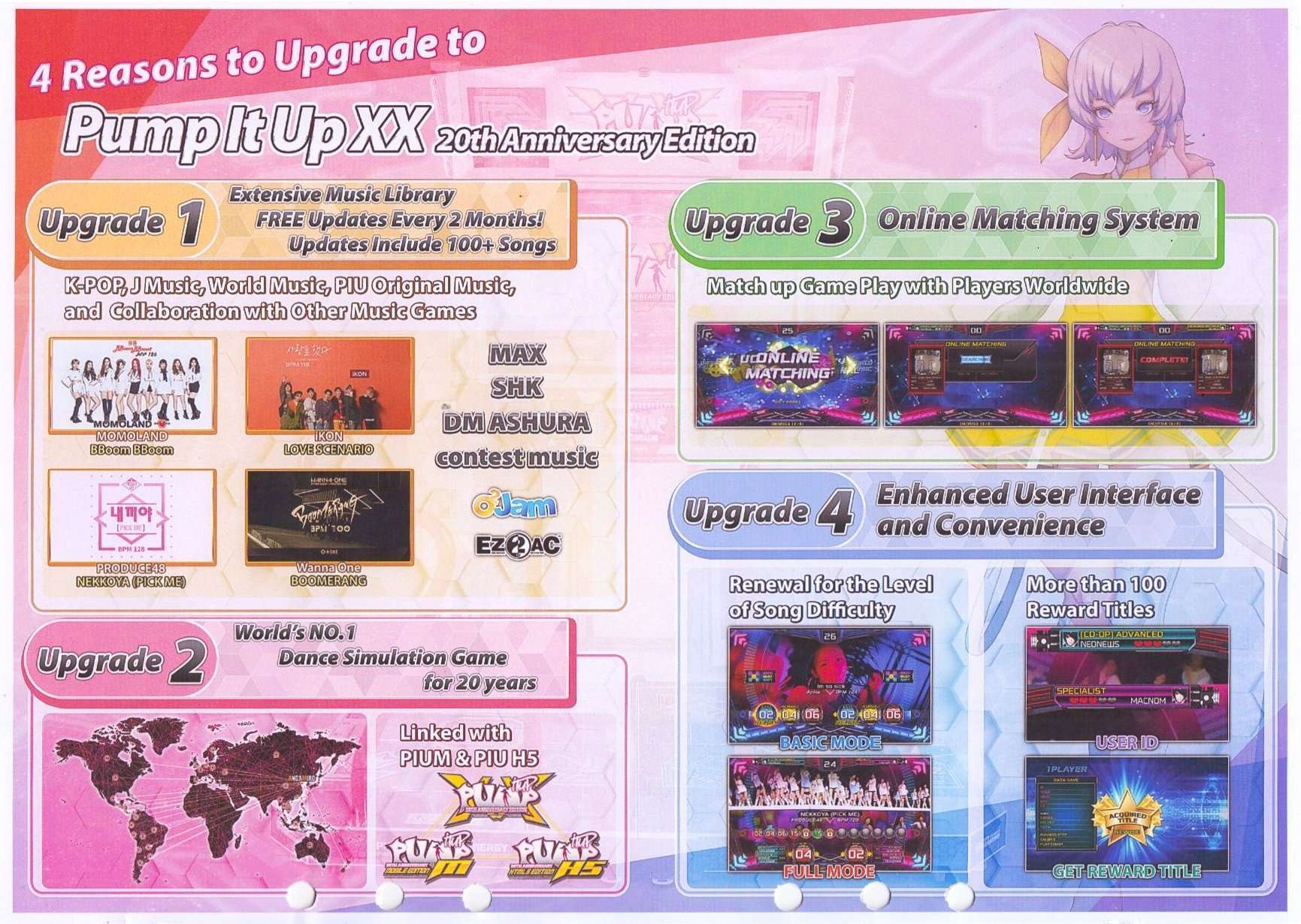 Pump It Up XX: The 20th Anniversary Edition memiliki lebih dari 100 lagu baru termasuk K-Pop, J-Music, dan musik dari berbagai komposer di seluruh dunia, selain itu juga berkolaborasi dengan permainan musik lainnya. Tidak lupa pula dalam seri ini dihadirkan pula fitur terbaru seperti “Online Matching”, di mana pemain dapat bermain secara bersamaan dengan pemain-pemain lain di seluruh dunia dan mengadu skor tertinggi yang juga membuat versi kali ini menghadirkaan pengalaman bermain yang lebih meriah dibanding sebelumnya. Bukan cuma itu saja. Dalam PIU XX, akan ada update sejumlah lagu-lagu baru setiap 2 bulan sekali. Bahkan pihak Andamiro juga menjanjikan untuk mengembalikan sejumlah lagu yang sempat hilang di versi sebelumnya.