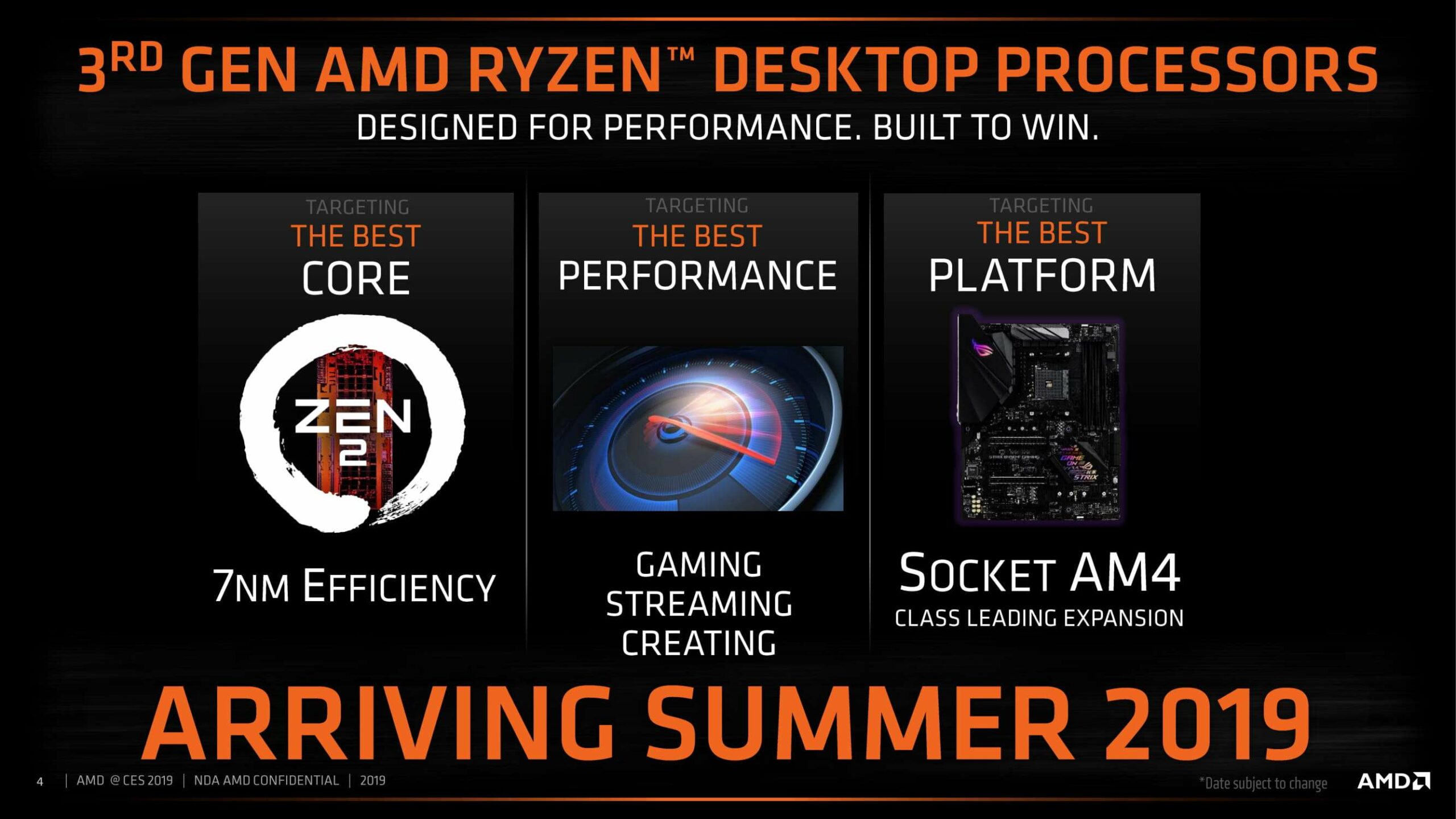 Pada demonstrasi langsung tersebut prosesor desktop AMD Ryzen™ Generasi Ketiga versi pra-produksi ditandingkan dengan sebuah prosesor Intel Core™ i9-9900K pada proses rendering real-time menggunakan software pengetesan Maxon Cinebench R15. Prosesor AMD Ryzen menunjukkan performa sebanding dengan konsumsi daya sekitar 30% lebih rendah. Sebagai tambahan, Dr. Lisa Su menunjukkan kekuatan teknologi AMD yang bekerja sama dengan sebuah demonstrasi game langsung dari prosesor desktop AMD Ryzen™ Generasi Ketiga pada platform soket AMD AM4 yang disandingkan dengan prosesor grafis AMD Radeon™ VII.