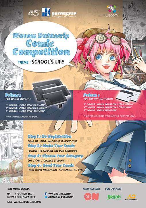 Wacom Datascrip mempersembahkan kompetisi komik bertajuk “Wacom Datascript Comic Competition” dengan tema School’s Life dan bergenre bebas mulai dari comedy, horror, romance, action, dsb. Kompetisi ini terbuka untuk siswa SMP, SMA, dan Mahasiswa, baik tim maupun perorangan. Kompetisi dibuka dari tanggal 1 Juli sampai 30 September 2014. Dapatkan Wacom Tablet masing-masing pemenang dan karya para pemenang akan mendapatkan kesempatan untuk dimuat di majalah re:ON comics.