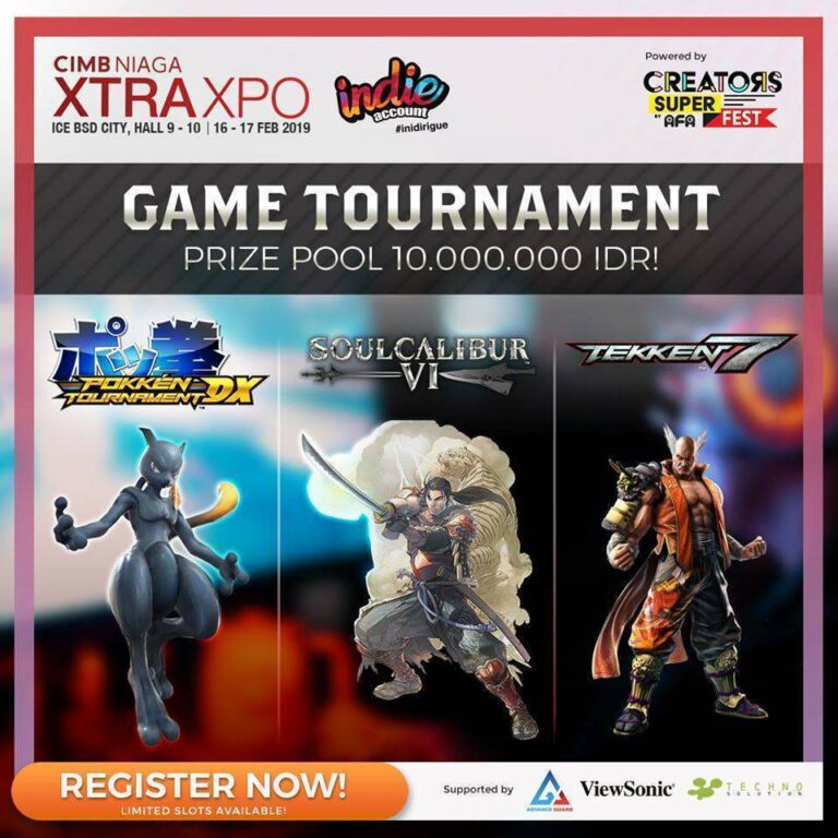Selain kompetisi cosplay, di sana juga akan ada turnamen game dimana para gamer bisa unjuk kemampuan untuk menjadi yang terbaik dan memenangkan hadiah total 10 juta rupiah persembahan dari CIMB Niaga!. Game yang dilombakan kali ini adalah Pokken Tournament, Soul Calibur VI, dan Tekken 7. Pendaftarannya juga gratis daftarkan dirimu di sini sekarang juga karena kuota peserta sangat terbatas!.