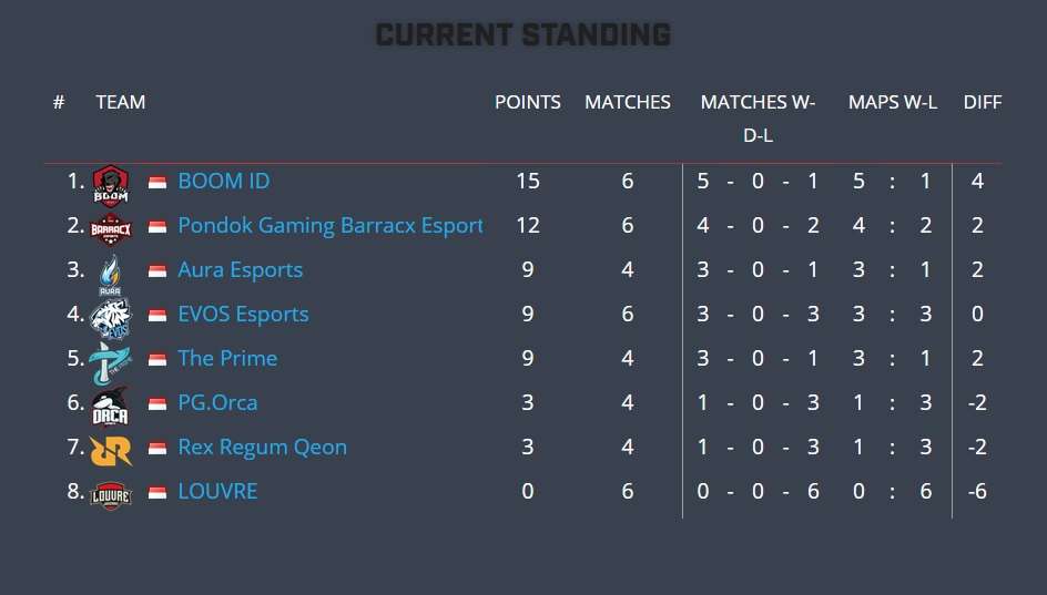 BOOM.ID berhasil menjadi pemuncak klasemen sementara setelah berhasil mengalahkan Louvre. Pada match ini, Fervian berhasil mencatatkan namanya sebagai pemain ketiga yang mencetak RAMPAGE dalam turnamen ini.