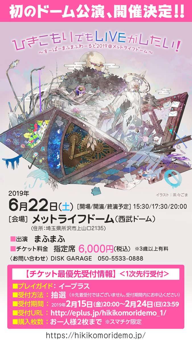 Salah satu utaite papan atas Jepang akhirnya mengadakan konser solo! Siapa lagi kalau bukan Mafumafu? Ya, utaite yang terkenal dengan suara tinggi ini akan mengadakan konser solo pada 22 Juni 2019 mendatang dengan judul “Super Mafumafu World 2019” (すーぱーまふまふわーるど2019). Digelar di Saibu Dome yang berkapasitas 33.000 orang, tiket masuk untuk konser solo ini dijual seharga 6000 yen (sekitar Rp 767.000,-).