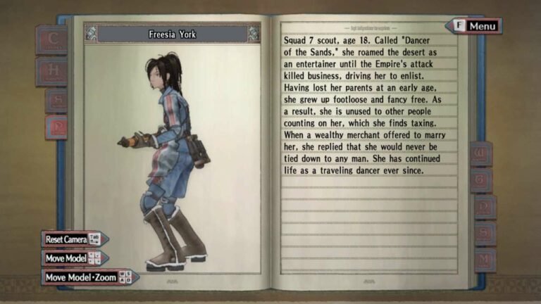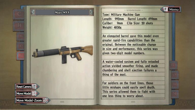 Sebelum membahas mengenai gameplay dalam gim ini, saya terlebih dahulu ingin membahas menu dari Valkyria Chronicles, yang menurut saya menarik sehingga patut diapresiasi. Walaupun terlihat rumit dan sedikit kompleks pada awalnya, setelah terbiasa, ternyata menu dalam gim ini cukup sederhana dan informatif. Menu utama dari Valkyria Chronicles berbentuk sebuah buku, yang berisi chapter dari Story Mode, yang dapat dipilih pemain apakah ingin menuju ke chapter selanjutnya, atau sekadar melihat cutscene yang pernah ditayangkan. Kemudian terdapat opsi tab select yang memungkinkan pemain untuk beralih ke menu lain. Menu turunan ini tidak kalah menarik dari story mode-nya, misalnya saja menu personnel yang berisi profil lengkap dari para karakter yang Anda mainkan, baik itu karakter utama maupun karakter sampingan. Uniknya, profil di menu ini akan selalu bertambah seiring dengan progress di mode cerita. Terdapat juga menu weaponry, yang berisi informasi senjata yang digunakan dalam gim ini. Selain story mode, Anda juga bisa memainkan mode skirmish. Dalam skirmish, Anda bisa memainkan skenario tambahan guna menambah uang dan juga XP.