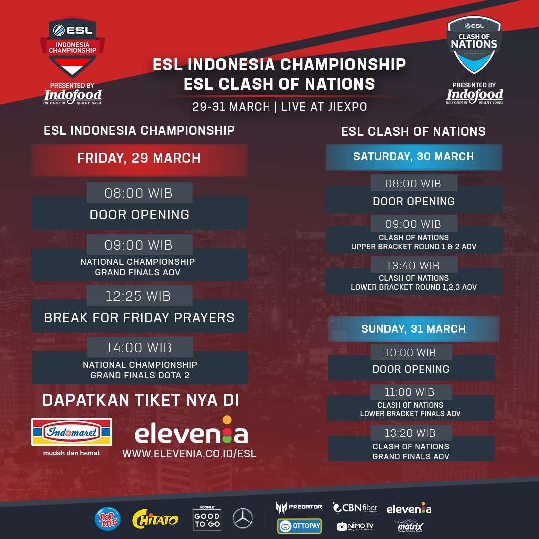 Event yang berlangsung selama 3 hari ini akan menampilkan tim Dota 2 terbaik Indonesia (BOOM ID dan Aura Esports) dan tim Arena of Valor (Saudara Esports dan EVOS Esports) memperebutkan hadiah sebesar USD 50,000 di Grand Final Kejuaraan ESL Indonesia. Kedua tim AOV Indonesia akan berhadapan melawan tim terbaik Asia Tenggara dalam ESL Clash of Nation pada hari Jumat dan Sabtu. Lebih dari 20 pemain dari 4 negara di Asia Tenggara lainnya yaitu Filipina, Thailand, Malaysia dan Vietnam akan bergabung dengan top two tim Arena of Valor Indonesia untuk memperebutkan gelar Region’s Best.