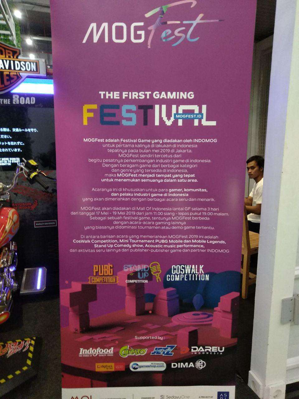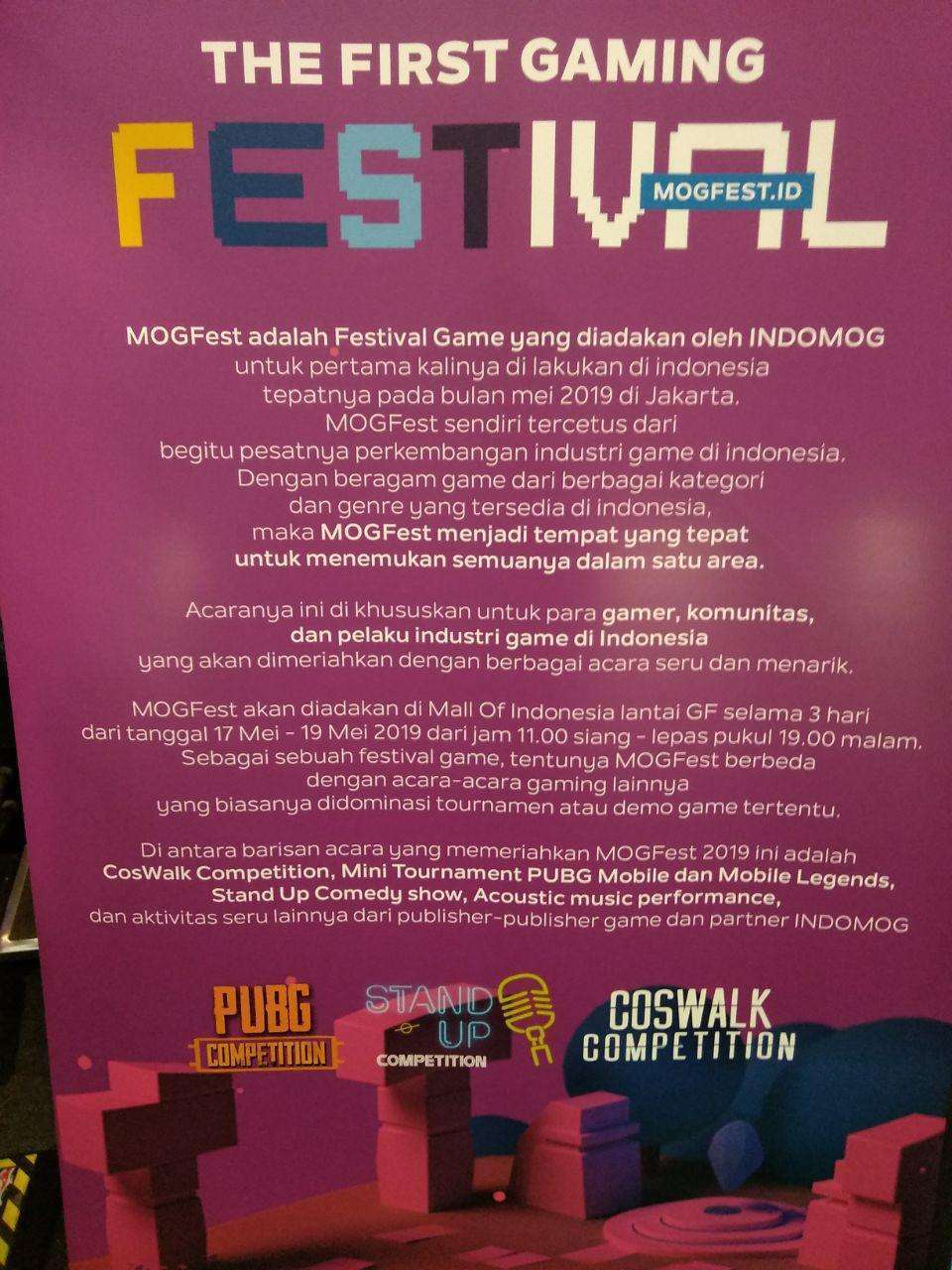 Sebagai sebuah festival gaming, MOGFest diadakan di Mall Of Indonesia tentunya lebih dari sekedar turnamen atau pameran game saja. Selama tiga hari penyelenggaraannya, dari tanggal 17 – 19 Mei 2019 MOGFest dipadati dengan rangkaian acara meriah dan diramaikan berbagai aktivitas dari INDOMOG, komunitas game, dan para pelaku industri game yang berpartisipasi di dalamnya.
