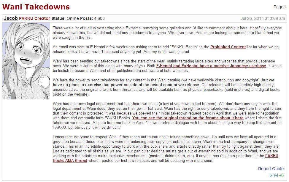 Dari pantauan diskusi di forums.e-hentai.org, diketahui bahwa penerbit Wani Magazine mengirimkan permintaan DMCA (permohonan penurunan berkas karena melanggar hak cipta) ke sejumlah situs online, termasuk situs e-hentai tersebut.