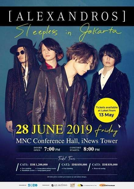Grup Band Rock Jepang Papan atas [ALEXANDROS] kembali ke Jakarta! [ALEXANDROS] Sleepless in Jakarta 2019 dijadwalkan pada 28 Juni di MNC Conference Hall, iNews Tower di Ibukota Indonesia tersebut.