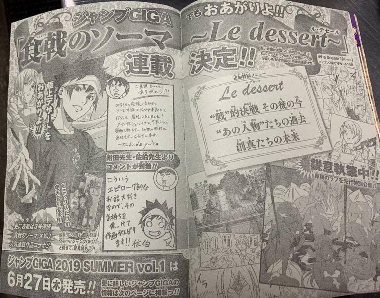 Manga pertarungan memasak “Shokugeki no Soma” pada pekan ini akan selesai serialisasinya di majalah komik mingguan “Weekly Shonen Jump”. Akan tetapi, pada tanggal 26 Juni 2019 mendatang, manga tersebut akan berlanjut di majalah “JUMP GIGA” dengan judul “Shokugeki no Soma ~Le Dessert~“. Namun, serial lanjutan tersebut akan berisi epilog setelah arc BLUE serta cerita masa lalu dari beberapa karakter yang belum terkuak. Selain itu, hanya ada 3 chapter yang akan dirilis di serial tersebut.