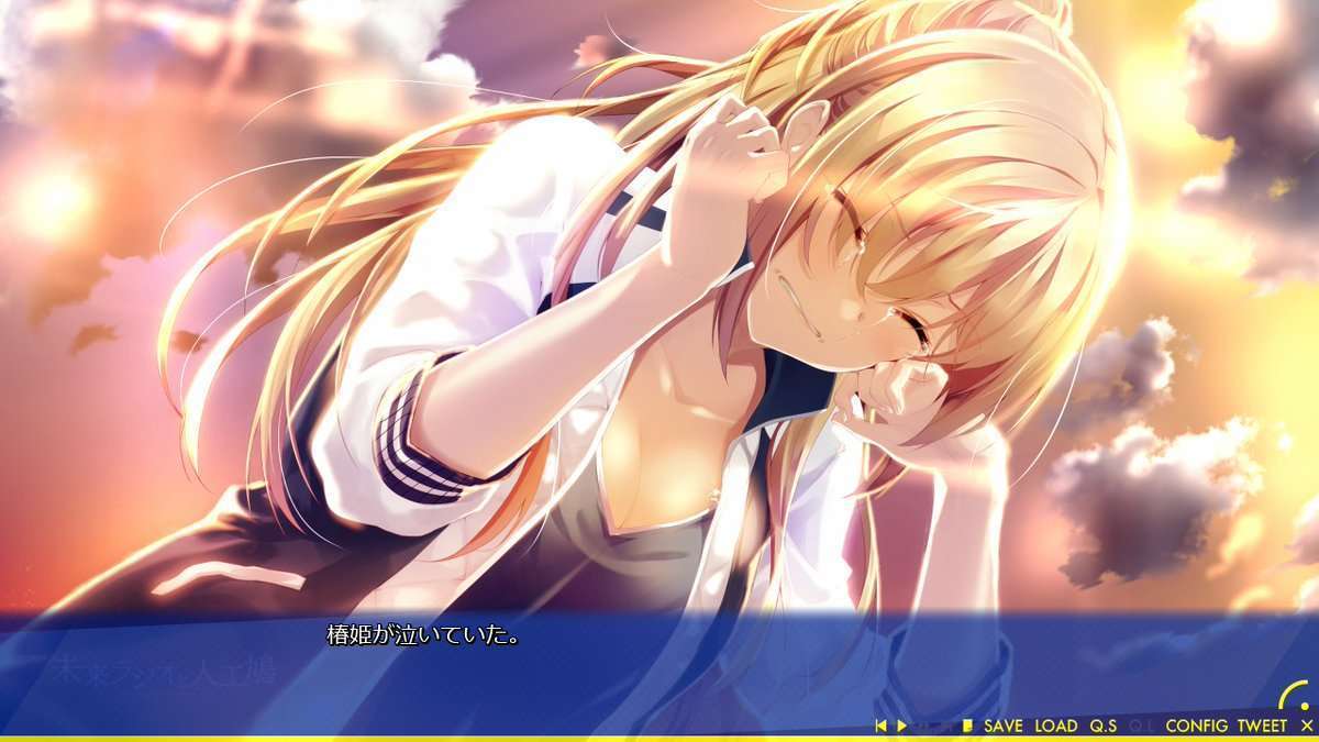 Tidak hanya perkembangan karakter Sora yang menarik, atau bahkan musik dan kualitas desainnya saja. Mirai Radio juga memiliki daya tarik lainnya dalam ceritanya yang bisa dibilang kurang padat. Namun di dalam kekurangan itu tersimpan plot twist dan kisah sedih alias Nakige (genre novel visual yang membuat pembacanya sedih). Tentu saja plot twist di sini lebih dititikberatkan kepada Sora dan Kaguya sendiri, yang membuat saya kaget sekaligus sedih karenanya. Mungkin kalau Anda memainkan novel visual ini Anda bisa merasakan apa yang saya rasa.