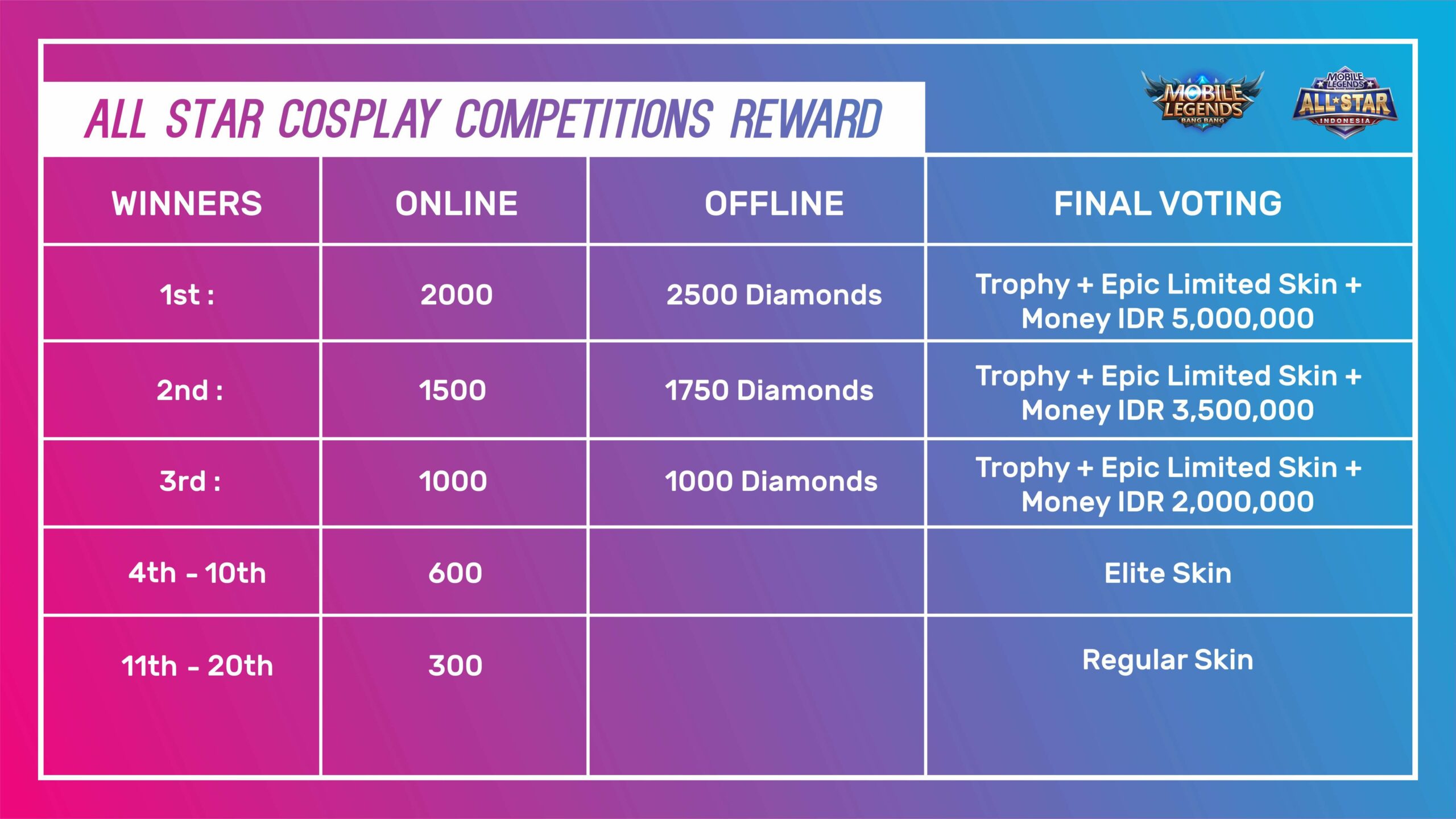 Selain voting tim ALL STAR , juga diadakan Cosplay Competition, dimana semua Cosplayer MLBB dapat berpartisipasi untuk mendapatkan hadiah, dengan TOP 3 pemenang favorit akan diundang dan diberikan penghargaan pada puncak acara.