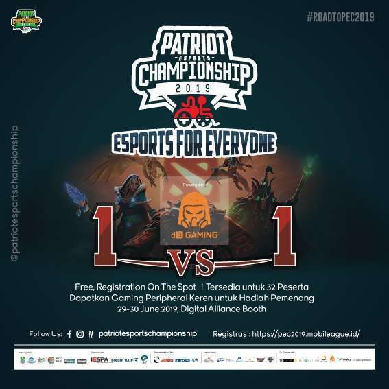 “Esports for Everyone – Road to PEC 2019” adalah event pembukaan dari “Patriot Esports Championship 2019” yang akan diselenggarakan di akhir caturwulan ke 4 tahun 2019 ini. Acara “Esports For Everyone – Road to PEC 2019” sendiri dijadwalkan akan berlangsung pada tanggal 29 dan 30 Juni 2019 mendatang. Bertempat di Mega Bekasi Hypermall, Tournament yang bertujuan untuk memfasilitasi minat dan bakat para pemuda di Bekasi ini berhadiahkan total IDR 20.000.000,-