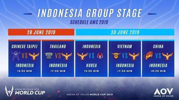 Tim Indonesia akan bertanding pada tanggal 28 dan 30 Juni 2019 pada babak grup AWC 2019. Di hari pertama, Indonesia akan menghadapi tim-tim kuat seperti Chinese Taipei dan Thailand. Dilanjutkan pada pertandingan tanggal 30 Juni, Indonesia mendapati jadwal padat dengan melawan 3 tim yaitu Korea, Vietnam, dan China. Babak Grup AWC 2019 sendiri akan menggunakan sistem BO1 (Best of 1) Double Round Robin. Empat tim teratas di Babak Grup akan melanjutkan pertandingan ke babak Playoffs. Berikut ini merupakan jadwal pertandingan Tim Indonesia di AWC 2019: