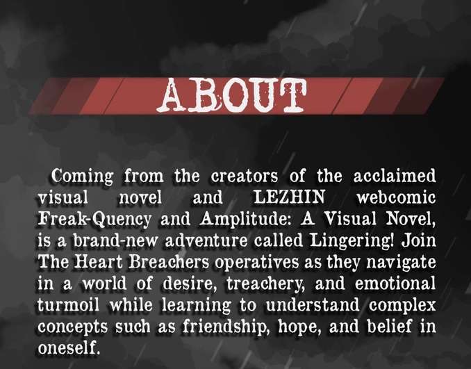 Ikuti kisah para Heart Breachers menghadapi ancaman para Lingering, sembari menjalani hidup dengan berhubungan satu sama lain, dengan hubungan emosional yang kompleks, dalam novel visual ini. Nantikan segera novel visual Lingering!