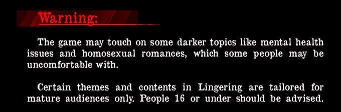 Lingering sendiri adalah novel visual dengan muatan cerita yang gelap, dengan sejumlah elemen yang cukup dewasa dan kontroversial. Karenanya novel visual ini lebih disarankan untuk dimainkan bagi mereka yang sudah berumur 16 tahun ke atas.