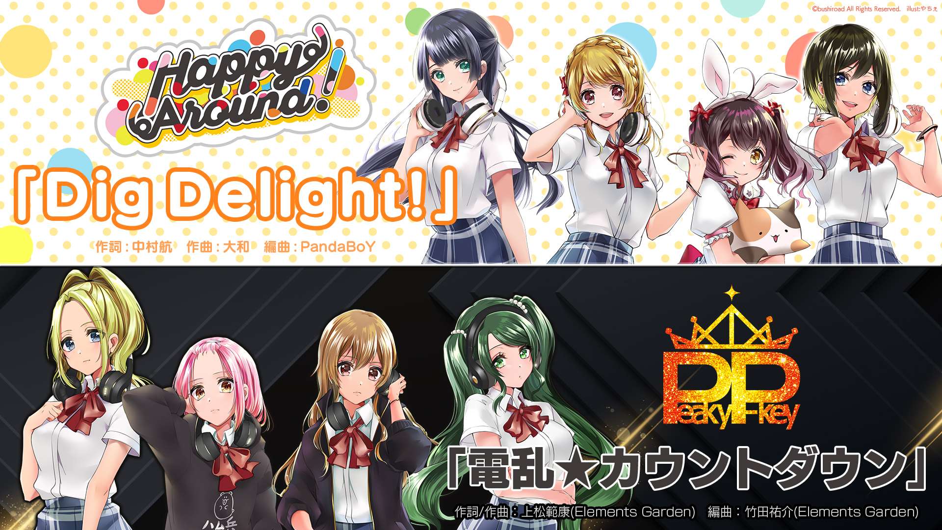 Dilansir dari website resmi D4DJ, sebuah preview lagu yang berjudul “Dig Delight” oleh Happy Around dan “Denran★Countdown” oleh Peaky P-Key telah dirilis di YouTube resmi D4DJ. Untuk lagu “Dig Delight“, komposisinya ditangani oleh Yamato, dengan lirik oleh Toru Nakamura, dan PandaboY menangani aransemennya. Sementara di lagu “Denran★Countdown“, lirik beserta komposisinya ditangani oleh Noriyasu Agematsu(Elements Garden), dengan aransemen oleh Yusuke Takeda(Elements Garden). Kedua lagu ini akan ditampilkan pada acara “D4DJ 1st LIVE” yang akan digelar di Makuhari Messe Convention Center, Chiba, pada 20-21 Juli 2019 mendatang.