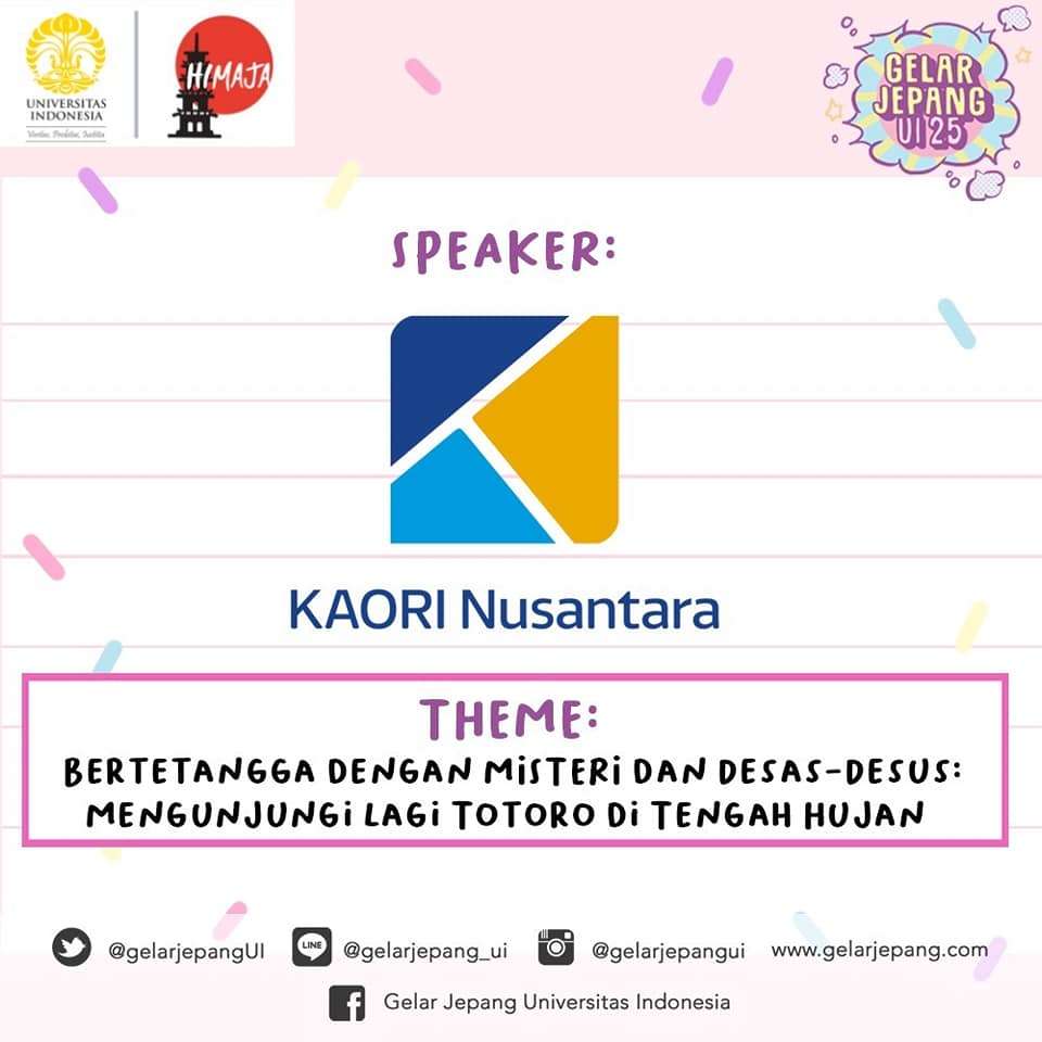 Dengan menggandeng KAORI Nusantara yang sudah berpengalaman selama 10 tahun dalam bidang kebudayaan anime dan ekonomi kreatif di Indonesia, acara Bedah Film My Neighor Totoro ini akan dipandu oleh Halimun Muhammad dari KAORI Nusantara dan Rizki Musthafa Arisun (Musatori), akademisi pemerhati budaya populer Jepang, komposer lagu dan ilustrator lepas.